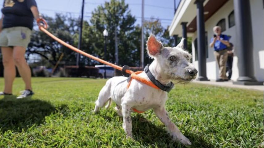 Scrim was a mess when Cheramie briefly recaptured him in October, with matted fur, missing teeth and a tattered ear. His trembling body was scraped and bruised, and punctured by multiple projectiles. A vet removed one, but decided against operating to take out a possible bullet.