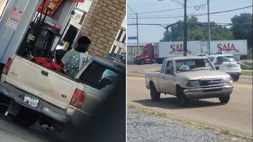 Police shared images of a man putting gas into a tan-colored pickup truck with a Texas license plate, saying that they need to identify him as part of a theft case from 2025. In the pictures, the man is wearing a white and gray shirt featuring characters from the cartoon "Rick and Morty."