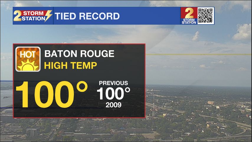 At 3:18 p.m. Monday, the temperature sensor at Baton Rouge Metropolitan Airport clocked in at 100°. This ties the record for the day which was set in 2009. With the humidity factored in, feels-like temperatures climbed even higher. Those values peaked near 110° in the capital city.