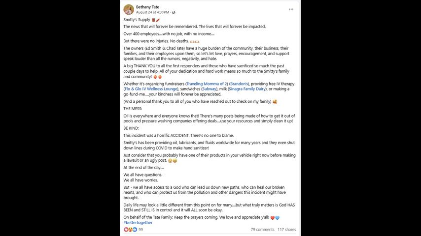 "Smitty's has been providing oil, lubricants, and fluids worldwide for many years and they even shut down lines during COVID to make hand sanitizer! Just consider that you probably have one of their products in your vehicle right now before making a lawsuit or an ugly post," Tate said. "At the end of the day, we all have questions. We all have worries."