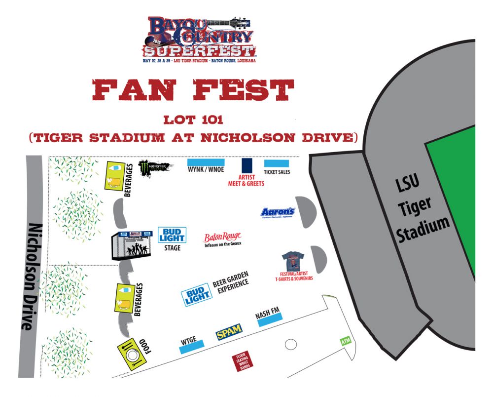 The Bayou Country Superfest Box Office will be located at Fan Fest outside of Tiger Stadium and will be open from May 27-29 from 10 a.m. to 9 p.m.