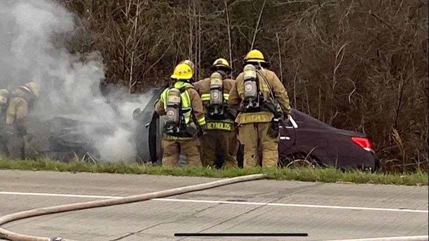 Images from the scene show officials putting out a vehicle fire off the road. The two right lanes are blocked on I-10 West and congestion is approaching Buff Road.