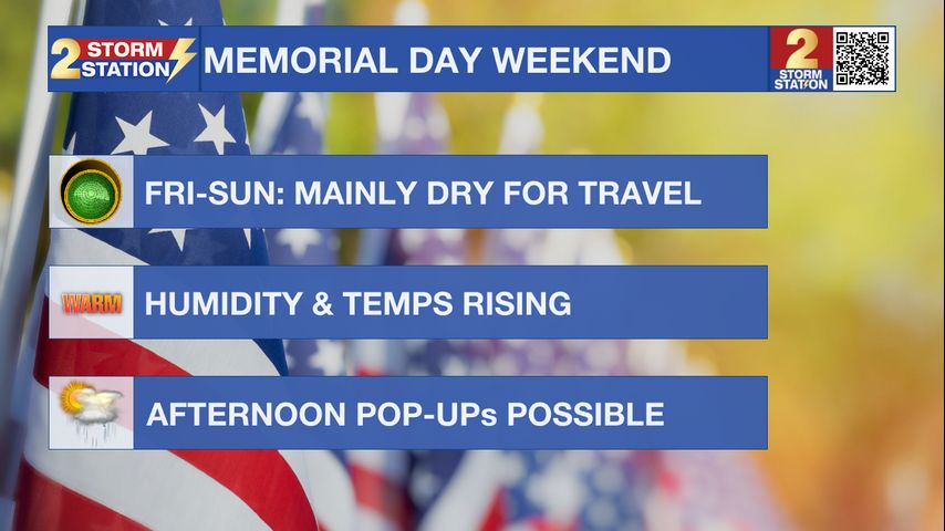 Memorial Day Weekend: Saturday and Sunday will start with mild mornings in the 70s, warming up to the low 90s by the afternoon with high humidity. A few isolated storms could pop up in the afternoon, but not everyone will get rain. Still, it's a good idea to keep an eye on the radar, as any passing storms could impact outdoor plans.