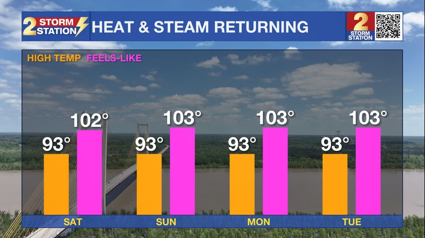 The Weekend: As we move into the weekend, an upper-level ridge over the Gulf will take control of our weather pattern, meaning warm and sinking air will cause hot and rain-free conditions. Highs will keep to the low 90s both afternoons beneath mostly sunny skies. Nights will offer little relief from the heat, with lows remaining in the mid-70s.