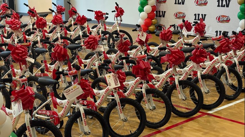 The pair not only gave kids bikes themed to Raising Cane's but also themed helmets to keep them safe during the holiday season.
