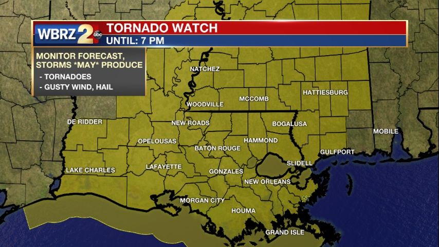 The National Weather Service has issued a TORNADO WATCH for the WBRZ Weather Forecast Area until 7PM Tuesday. This means conditions are favorable for tornadoes and/or damaging winds in and around the watch area.