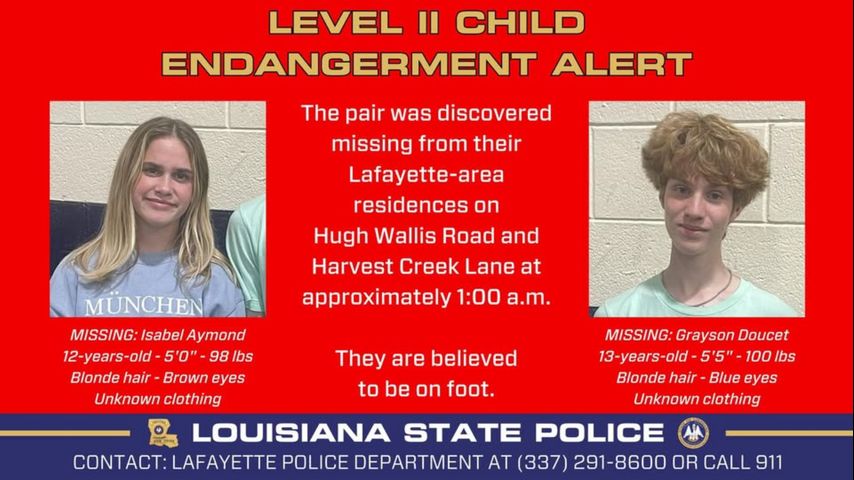 LSP said Isabel Aymond, 12, and Grayson Doucet, 13, went missing from their home around 1 a.m. State Police believe they are travelling on foot.