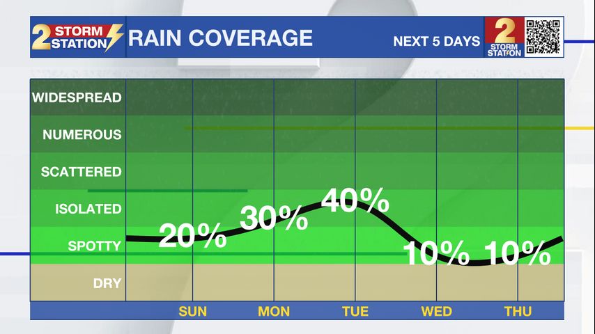 Next Week: Some shifts in our weather pattern are expected early next week. A few weak disturbances will move through, making the atmosphere more supportive of rain. This will lead to increased chances for showers and storms, especially on Monday and Tuesday. Look for coastal storms to fire up in the morning hours before spreading inland by afternoon. By midweek, drier air in the mid-levels of the atmosphere will start to move in, which should bring a noticeable drop in rain coverage through the rest of the week. Despite that, it’ll still feel quite humid at the surface, with highs hovering in the mid-90s.