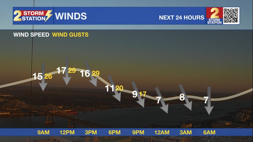 A strong cold front has pushed through South Louisiana, bringing much cooler air and gusty winds for Sunday. The chilly pattern continues into early next week with freezing temperatures possible by Tuesday morning.