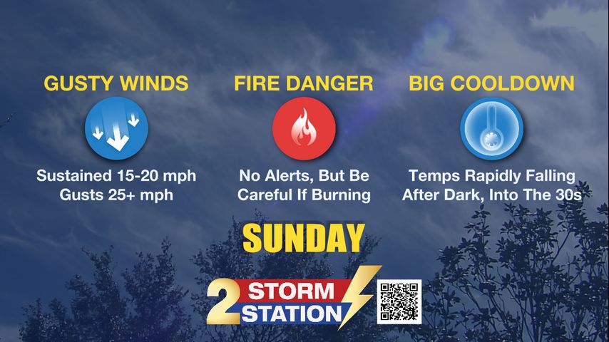 Dry air combined with gusty northwest winds up to 20–25 mph will create an elevated fire danger on Monday. Avoid outdoor burning if possible, and follow any local burn restrictions that may be issued.
