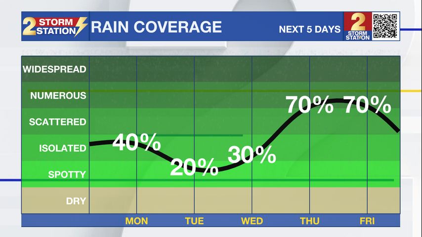 Up Next: We will see a bit less afternoon storms Tuesday and Wednesday, with spotty to isolated coverage. Highs will reach into the mid 90s as a result, with feels-like temperatures in the triple digits.