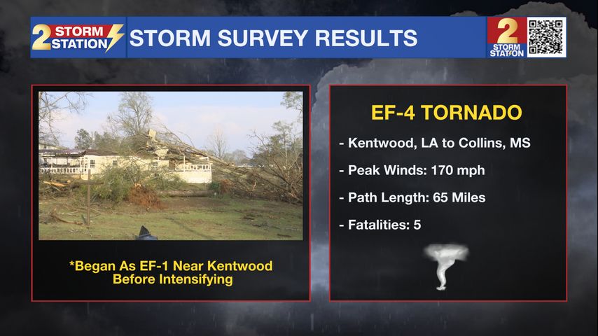 KENTWOOD - A National Weather Service survey team confirmed that a tornado touched down east of Kentwood in Tangipahoa Parish on Saturday afternoon at 12:19 p.m.. The tornado proceeded into Mississippi where the tornado eventually reached EF-4 strength west of Tylertown, MS. Winds were estimated to peak around 170 mph. However, the damage surveyed near Kentwood was determined to be that of an EF-1 tornado with winds between 86-110 mph.