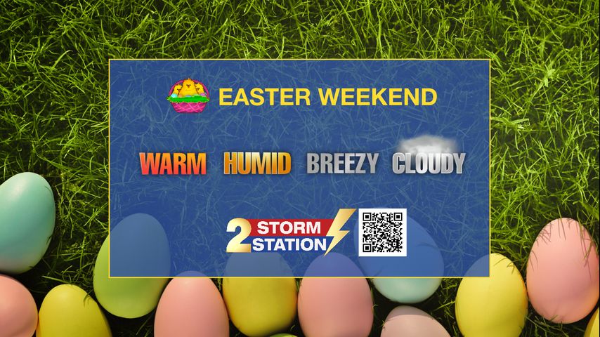 Easter Weekend: Saturday morning will be noticeably more muggy than recent days, beginning in the upper 60s. A mostly cloudy and breezy afternoon will follow, but it will remain dry. Extra clouds compared to Friday may keep highs a degree or two cooler, but we’ll still see highs in the mid to upper 80s.