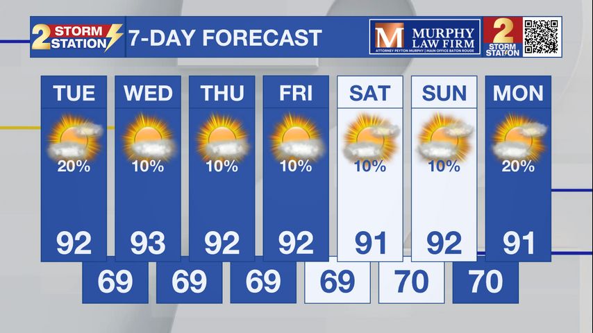 Today and Tonight: High pressure overhead keeps conditions mostly dry. Subsidence aloft will suppress most storm activity, though a spotty late afternoon shower isn’t impossible. Highs will top out in the low to mid 90s, while overnight lows settle into the upper 60s north and low to mid 70s south. The dry weather has Burn Bans in place for St. Helena and Tangipahoa parishes.