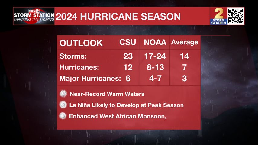ORIGINAL STORY: The final update to the 2024 Hurricane Season Outlook from Colorado State University has been posted. Their forecast now calls for 23 named storms, 12 hurricanes, and 6 major hurricanes. This update shows 2 fewer total named storms while the number of hurricanes and major hurricanes remains the same.
