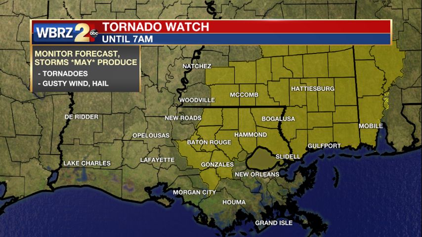 The National Weather Service has issued a TORNADO WATCH for the WBRZ Weather Forecast Area until 7am Friday. This means conditions are favorable for tornadoes and/or damaging winds in and around the watch area.